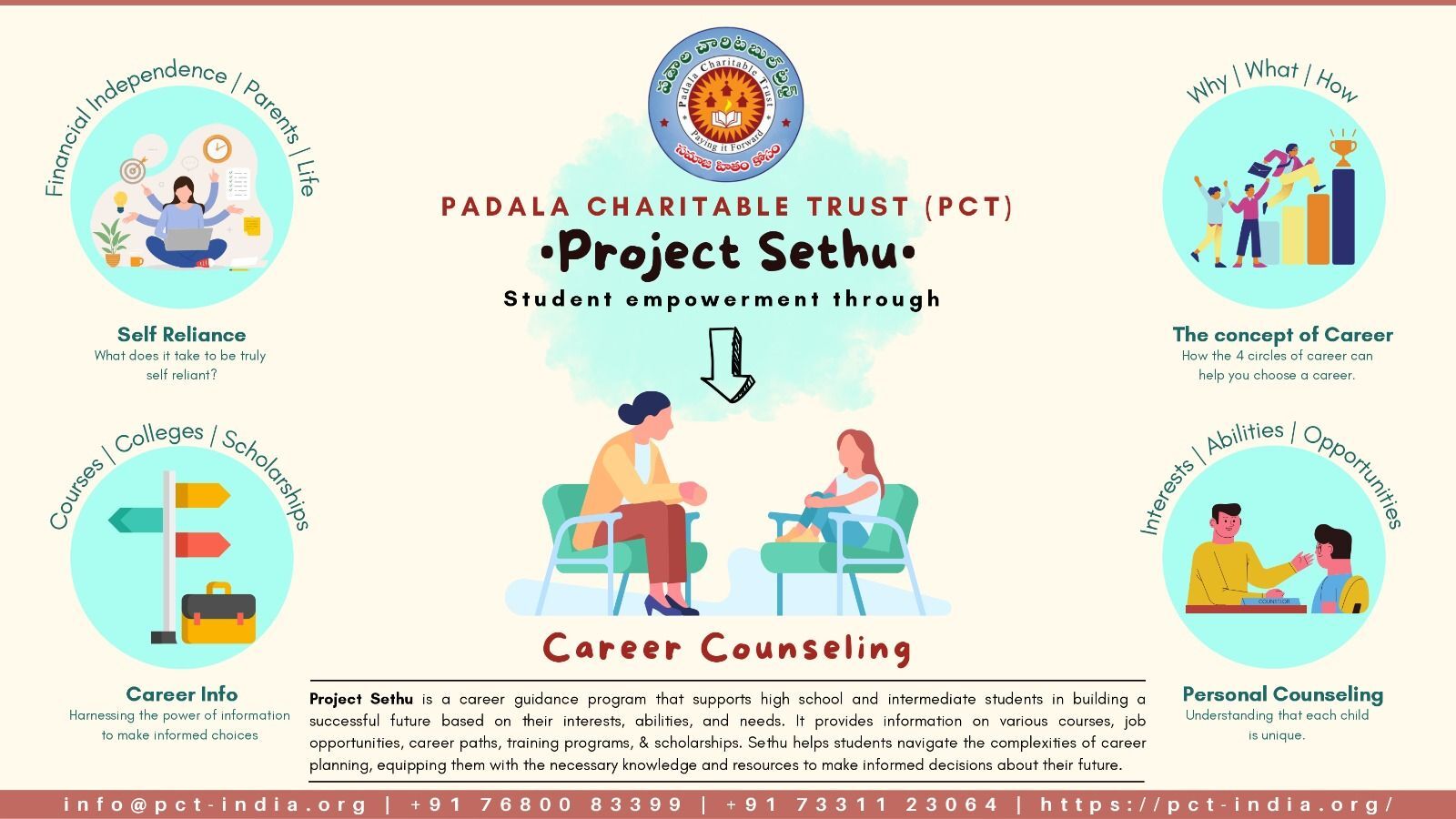 PCT has a publication in Telugu, a comprehensive handbook on career guidance titled SETHU. This essential resource is designed specifically for students navigating their options after 10th grade and intermediate levels. The book provides an in-depth look at various courses available within the education system, covering a wide range of fields such as science, arts, commerce, vocational training, and professional courses. It aims to equip students with the information they need to make informed decisions about their educational and career paths.